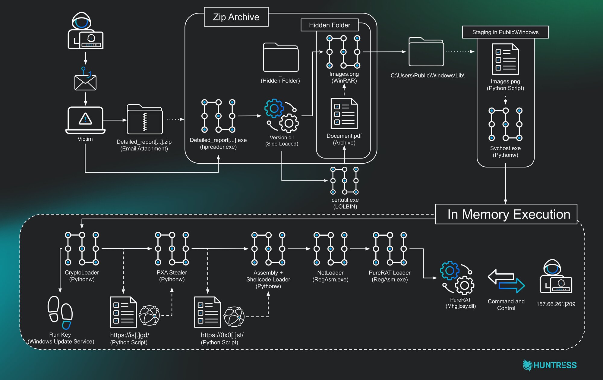 Security researcher James Northey from Huntress explains, "This campaign shows a clear progression, starting with a simple phishing email and escalating through layers of loaders, evasion techniques, and credential theft. The final payload, PureRAT, gives the attacker complete control over the compromised computer."